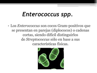 Los Enterococcus spp. son cocos Gram-positivos que se presentan en parejas o cadenas cortas y son comensales en el intestino humano. Son organismos facultativos aerobios que prefieren usar oxígeno pero sobreviven sin él, y exhiben gamma-hemolisis en agar sangre. Son notablemente resistentes a antibióticos como penicilinas, cefalosporinas y aminoglicósidos, y se han descrito casos de Enterococcus resistentes a vancomicina en infecciones hospitalarias.