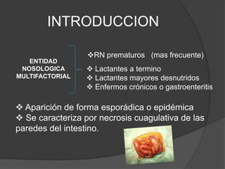 El documento resume los aspectos clave de la enterocolitis necrotizante (ECN) en 3 oraciones: La ECN es una enfermedad intestinal potencialmente mortal que afecta principalmente a recién nacidos prematuros y se caracteriza por necrosis de la pared intestinal. La etiología es multifactorial e involucra factores como la prematuridad, daño hipóxico-isquémico, alimentación enteral y agentes infecciosos. Los síntomas incluyen distensión abdominal, vómito con contenido bilioso y sangre en he