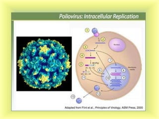 Este documento describe la familia Picornaviridae, que incluye los géneros Enterovirus, Rinovirus, Heparnavirus y Aphtovirus. Se enfoca en el género Enterovirus, describiendo su estructura, multiplicación, patogenicidad, epidemiología y diagnóstico. También cubre brevemente el virus de la poliomielitis, uno de los enterovirus más importantes.