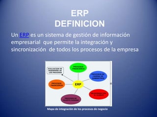 Este documento define un ERP como un sistema de gestión de información empresarial que permite integrar y sincronizar todos los procesos de una empresa. Explica que un ERP es adaptable, modular e integral, y describe las etapas clave de implementación de un ERP, incluida la definición de necesidades, búsqueda de alternativas, selección y los beneficios de mejorar los procesos empresariales y la toma de decisiones.