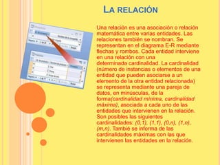 El diagrama Entidad-Relación es un método para representar conceptualmente los datos y las relaciones de un sistema. Consiste en entidades asociadas por relaciones, representadas mediante flechas y rombos. Las relaciones se definen por su tipo (uno a uno, uno a muchos, muchos a uno, muchos a muchos) y su cardinalidad, que indica el número de instancias asociadas entre las entidades. El proceso de diseño de una base de datos incluye determinar su objetivo, organizar la información en tablas normalizadas y definir las relaciones entre ellas.