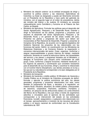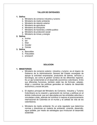 El documento define varios ministerios y entidades del gobierno colombiano. Define los ministerios de comercio exterior, medio ambiente, relaciones exteriores, agricultura, protección social, minas y energía, y sus funciones. También define entidades como el Invima, Dian e Incoder, y sus roles. Por último, define entidades financieras como Bancoldex, Fiducoldex y Proexport, y sus objetivos de apoyar las exportaciones colombianas.