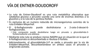 La vía de Entner-Doudoroff es una ruta metabólica alternativa a la glucolisis y la ruta de las pentosas fosfato que cataliza la degradación de la glucosa a piruvato usando enzimas diferentes. Algunas bacterias usan esta ruta en lugar de la glucolisis. La glucosa se convierte en dos moléculas de piruvato con la formación de ATP, NADH y NADPH.