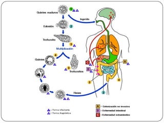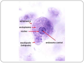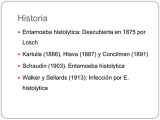 Este documento describe Entamoeba histolytica, el parásito que causa amebiasis. Explica la historia de su descubrimiento, epidemiología, morfología, ciclo de vida, manifestaciones clínicas de la infección intestinal y extraintestinal, y métodos de diagnóstico.