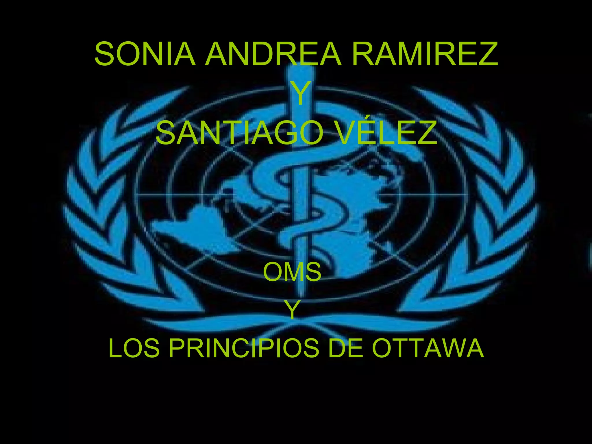 La OMS es la organización de salud de la ONU. Tiene como objetivo que todos los pueblos del mundo puedan gozar del máximo grado de salud lograble. Define la salud de forma amplia, como un estado de bienestar físico, mental y social. Realiza actividades como clasificar enfermedades, promover vacunaciones y el acceso a medicamentos. La Carta de Ottawa estableció principios para la promoción de la salud, como considerarla un recurso de la vida diaria y no solo la ausencia de enfermedades, y reconocer que