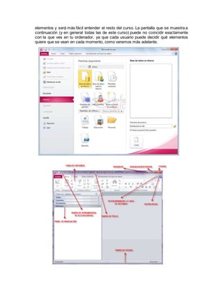 El documento describe los elementos principales de la interfaz de usuario de Microsoft Access, incluyendo la cinta de opciones, las pestañas Archivo e Inicio, la barra de estado y el panel de navegación. Explica cómo crear una nueva base de datos vacía y cómo la tabla por defecto Tabla1 aparece inicialmente en la base de datos recién creada.