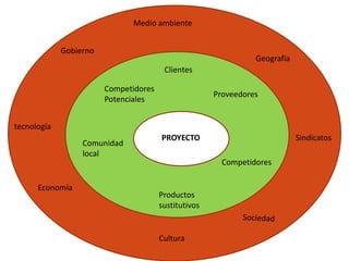 El documento describe los diferentes tipos de entornos que pueden afectar a un proyecto, incluyendo el entorno general que afecta a todos los proyectos y el entorno específico que afecta directamente al proyecto. También presenta métodos para evaluar estos entornos y analizar los factores internos y externos que pueden influir en el proyecto.