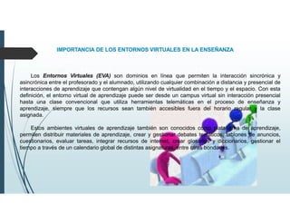 Este documento describe la importancia de los entornos virtuales en la enseñanza. Explica que los entornos virtuales permiten la interacción sincrónica y asincrónica entre profesores y estudiantes de manera remota y presencial. Además, estos entornos virtuales de aprendizaje, también conocidos como plataformas de aprendizaje, permiten distribuir materiales educativos y gestionar debates, evaluaciones y recursos en línea. Finalmente, enumera los principios metodológicos clave para la elaboración de materiales
