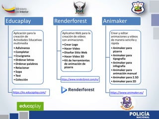 Educaplay permite crear actividades educativas multimedia como adivinanzas, completar, crucigramas u ordenar palabras. Renderforest es una herramienta para crear videos y animaciones con logos, videos 3D o pizarras animadas. Animaker facilita la creación y edición de animaciones y videos de forma sencilla a través de opciones como animación manual, tipografía o infografía.