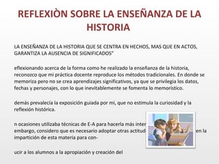 El documento reflexiona sobre la enseñanza tradicional de la historia, la cual se centra en hechos y datos en lugar de significados. Esto garantiza la ausencia de aprendizajes significativos, ya que se privilegia la memorización sobre la comprensión. El autor reconoce que su propia práctica docente ha reproducido estos métodos tradicionales centrados en la transmisión de información en lugar de estimular la curiosidad y reflexión crítica de los estudiantes.