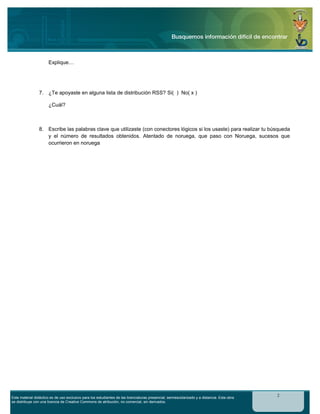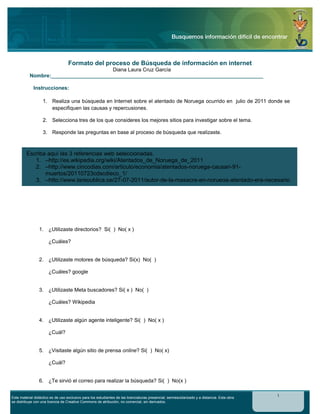 El documento describe un proceso de búsqueda de información sobre los atentados de Noruega de 2011. La persona realizó búsquedas en Google y Wikipedia y seleccionó 3 sitios web como referencias que incluyen Wikipedia, un sitio de noticias español, y un sitio de noticias peruano. Luego respondió preguntas sobre los métodos y herramientas utilizadas en la búsqueda como motores de búsqueda, metabuscadores y palabras clave.