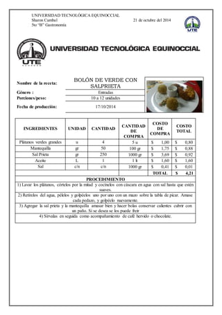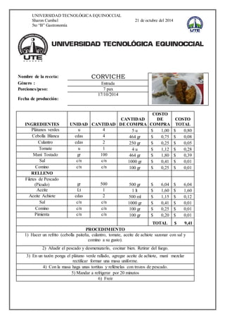 El documento contiene 8 recetas de platos ecuatorianos tradicionales, incluyendo Corviche, Bolón de Verde, Sal Prieta, Chupe de Camarones, Sopa de Bolas de Verde, Biche de Pescado y Sopa de Bolas de Verde. Cada receta lista los ingredientes necesarios y los pasos del procedimiento para preparar cada plato.
