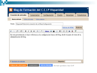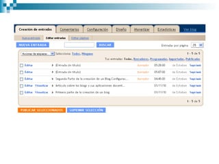 El documento describe las diferentes formas de crear entradas en un blog y las herramientas de edición disponibles, incluyendo opciones para formato de texto, enlaces, imágenes, y edición de entradas existentes. Explica cómo crear nuevas entradas desde el escritorio del blog, desde la vista de usuario registrado, o desde la sección de administración, y detalla las diversas funciones del editor de entradas como deshacer, rehacer, fuentes, tamaños, negrita, cursiva, subrayado, color, enlaces, imágenes, saltos