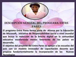 Este documento describe un plan de capacitación para docentes en el uso de nuevas tecnologías en la educación. El objetivo es apoyar a las escuelas con un modelo innovador de capacitación docente que incorpore las nuevas tecnologías para mejorar la calidad educativa. El programa busca desarrollar habilidades tecnológicas en los docentes y motivarlos a usar herramientas digitales de forma dinámica en sus clases.