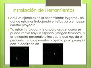 El documento describe la instalación de herramientas Pygame y la creación de un personaje principal y enemigos para un proyecto de videojuego a través de encuestas. Se realizaron encuestas para determinar el género del juego, el diseño del personaje principal y los enemigos. El trabajo en equipo permitió cumplir con las metas establecidas para la semana. El documento también discute el uso del algoritmo MiniMax para la inteligencia artificial en el juego.