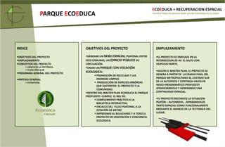 El documento presenta un proyecto de parque ecológico llamado Parque EcoEduca que se propone recuperar un área urbana no funcional en Santiago de Chile. El parque tendrá como objetivos generar un espacio peatonal entre dos comunas, crear un área verde con vocación ecológica que promueva el reciclaje y las energías limpias, y complementar la biblioteca interactiva y estación de metro adyacentes. El parque se ubicará en la intersección de dos avenidas y aprovechará el terreno para separ