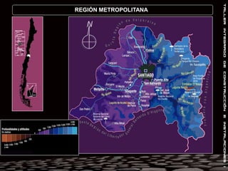 El documento presenta información sobre los tipos de suelos en la Región Metropolitana de Santiago. Describe las características geológicas de las diferentes formaciones de rocas y sedimentos. Explica los principales horizontes de los suelos, las propiedades de los suelos expansivos y los tipos de suelos presentes como la grava de Santiago. También cubre temas como la clasificación geotécnica de los suelos, las problemáticas relacionadas y la aptitud agrícola de los suelos en la región.