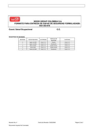 Este documento registra la entrega de gafas de seguridad a un trabajador. Se especifica el nombre y número de identificación del trabajador, así como las gafas entregadas. Se brindan recomendaciones sobre el cuidado y uso adecuado de las gafas de seguridad.