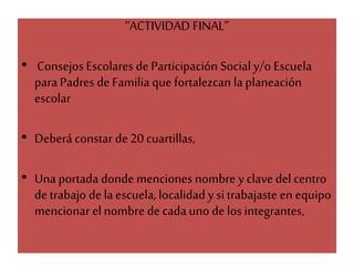 El documento presenta las instrucciones para completar el proyecto final de un diplomado en liderazgo educativo. Se requiere elaborar un proyecto de 20 páginas sobre consejos escolares de participación social o escuelas para padres que fortalezcan la planeación escolar. Además, se proporcionan detalles sobre cómo guardar el archivo en el sistema, incluyendo el nombre del archivo y la selección de una temática.