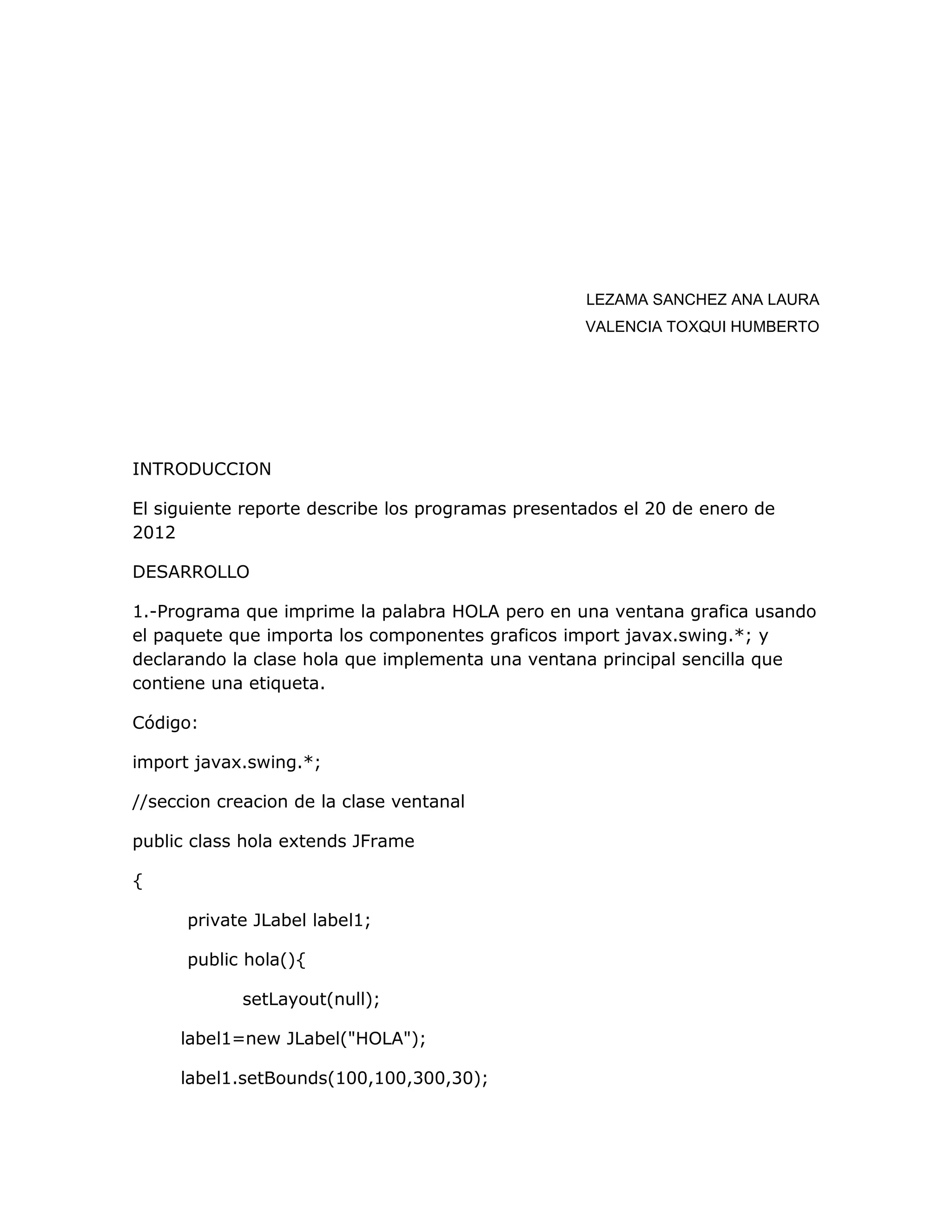 El documento presenta 4 programas escritos en Java que demuestran el uso de hilos concurrentes y paralelos. El primer programa crea una ventana gráfica simple que muestra la palabra "HOLA". Los programas 2 y 3 imprimen cadenas de texto usando hilos con herencia y la interfaz Runnable. El programa 4 establece prioridades y atributos como "daemon" en hilos creados con herencia e interfaz.