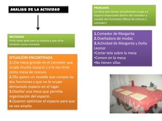 El documento describe el proceso de diseñar una nueva mesa para Margarita que sirva como mesa de costura y comedor. La mesa actual ocupa mucho espacio en el comedor y Margarita quiere un mueble que cumpla ambas funciones pero ocupe menos espacio. El diseñador creará un mueble con una corredera que permita ocultar la zona de costura para optimizar el espacio cuando solo se use para comer.