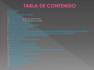 El documento presenta una serie de temas relacionados con el hábitat urbano y la ciudad sostenible, con un enfoque en la localidad de Candelaria en Bogotá. Inicialmente incluye mapas conceptuales sobre hábitat habitable, hábitat urbano y desarrollo sustentable. Luego describe visitas realizadas a Candelaria para analizar su medio natural, construido y social, así como aspectos de renovación urbana, calidad de vida y desarrollo sustentable en la localidad. Finalmente presenta conclusiones sobre el habitar en Can