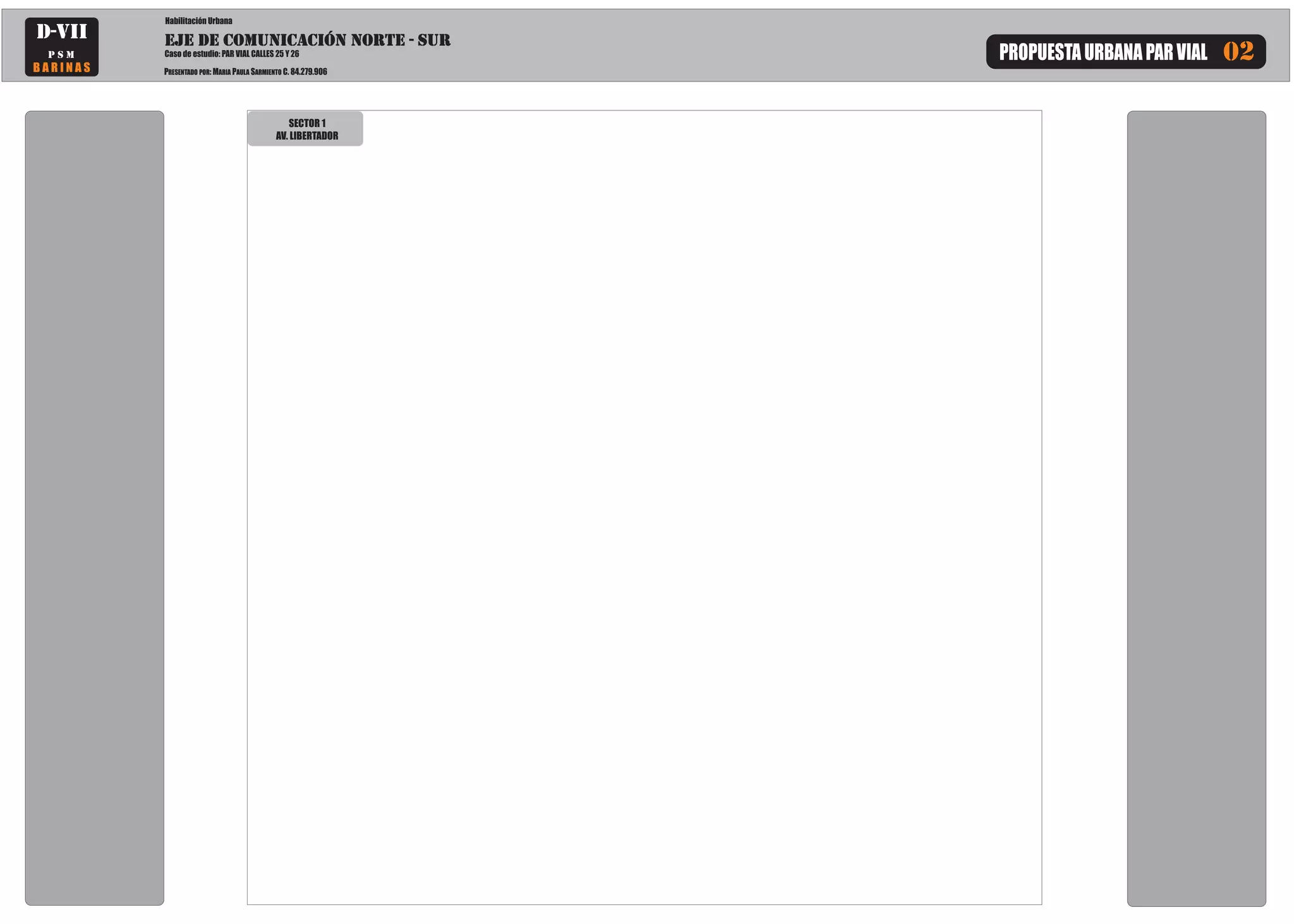 Este documento presenta una propuesta urbana para mejorar el par vial de las calles 25 y 26 en la ciudad de Barinas, Venezuela. La propuesta se centra en mejorar la movilidad en el eje de comunicación norte-sur a través de la intervención en el sector 1, incluyendo mejoras al mobiliario urbano y la avenida Libertador.