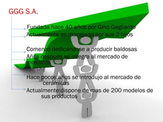 El documento resume la historia y estrategia de GGG S.A., una empresa fundada hace 40 años que inicialmente producía baldosas y luego se expandió a mosaicos y cerámicas. Actualmente ofrece más de 200 productos y factura $2.300.00 mensuales. Su plan estratégico incluye aumentar la producción a plena capacidad mediante la contratación de más personal y importar productos nuevos de Europa para ingresar a un nicho específico.