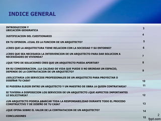 Este documento presenta los resultados de encuestas realizadas a 10 inquilinos sobre su percepción del papel de los arquitectos. La mayoría cree que los arquitectos se dedican principalmente a dibujar planos y que su intervención es necesaria para proyectar viviendas de manera adecuada. Aunque algunos dudan del valor de contratarlos debido al costo, la mayoría opinaría solicitar sus servicios para asegurar comodidad, diseño y resistencia en el hogar. El documento concluye que la sociedad aún tiene una comprensión limit