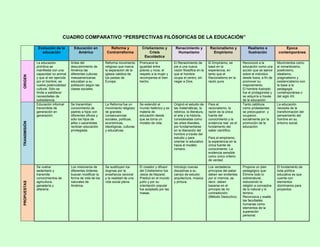 El documento presenta un cuadro comparativo de las diferentes perspectivas filosóficas de la educación a través de la historia. Cubre desde la educación primitiva hasta la época contemporánea, describiendo el origen, transmisión, propuestas educativas, instituciones y culminación/finalidad de cada período. El cuadro muestra cómo la educación ha evolucionado de ser informal a ser un derecho y obligación para todos, y cómo las instituciones educativas se han transformado para adaptarse a una sociedad cambiante.