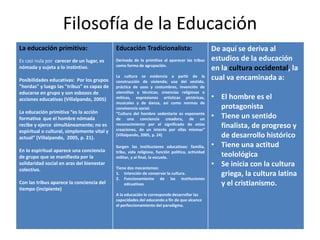 Este documento resume el desarrollo histórico y las perspectivas filosóficas de la educación. Comienza con la educación primitiva y tradicionalista, luego describe la educación en Grecia, Roma, el cristianismo y la escolástica. También cubre el Renacimiento, la educación en América, la Reforma, Contrarreforma y los movimientos racionalista y empirista. En general, traza la evolución del pensamiento educativo a través de los tiempos.