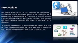 El documento describe diferentes modalidades educativas como la presencial, e-learning, blended learning y mobile learning. También analiza el uso de las tecnologías de la información y comunicación (TIC) en la educación, señalando que permiten enriquecer la enseñanza y facilitar el acceso universal a la educación. El docente debe adoptar un nuevo rol al incorporar las TIC, centrándose en transformar al alumno en el protagonista de su aprendizaje.