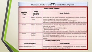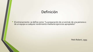 El documento habla sobre el entrenamiento deportivo. Explica que el entrenamiento se define como la preparación de una persona mediante ejercicios apropiados para mejorar el rendimiento. Describe principios básicos como la individualidad, especificidad y periodización. También analiza factores como la fatiga, dolor muscular, disnea y la utilidad de las pruebas de esfuerzo cardiopulmonar.
