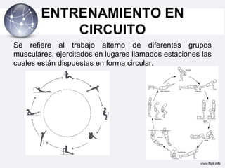 El entrenamiento en circuito implica alternar diferentes grupos musculares en estaciones dispuestas en forma circular. Los circuitos pueden variar en cantidad de ejercicios y repeticiones. Existen circuitos de tiempo fijo, con repeticiones fijas en cada estación en un intervalo determinado, y circuitos recreativos con bases para deportes como voleibol, fútbol y baloncesto.