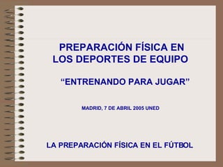 El documento habla sobre la preparación física en los deportes de equipo, especialmente en el fútbol. Explica que el objetivo principal de la preparación física debe ser mejorar la capacidad de juego del futbolista, no solo aumentar su condición física. También destaca la importancia de utilizar métodos de entrenamiento específicos para cada deporte y entrenar de manera integrada con el juego en lugar de enfocarse exclusivamente en el aspecto físico.