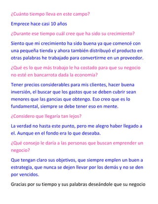El Sr. José de Jesús es dueño de una tienda de abarrotes y distribuidor de productos en su región. Comenzó su negocio hace casi 10 años con una pequeña tienda y un préstamo, buscando proveedores con buenos precios. Ahora ha crecido hasta convertirse en proveedor también. El consejo que da a nuevos emprendedores es que tengan claros sus objetivos, usen buenas estrategias y no se rindan.