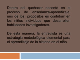 Este documento proporciona recomendaciones metodológicas para realizar entrevistas orales como método de aprendizaje de la historia. Explica que la selección del testimonio, el lugar y la guía de la entrevista son elementos clave. También cubre la transcripción y publicación de las entrevistas, destacando la importancia de respetar el discurso del entrevistado y hacerlo accesible para los lectores. El objetivo es desarrollar habilidades de investigación en los estudiantes a través de este método.