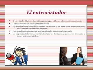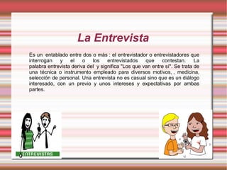 Este documento describe los elementos clave de una entrevista. Una entrevista implica un diálogo entre un entrevistador y uno o más entrevistados, con cada parte teniendo intereses y expectativas. Para que sea exitosa, el entrevistador debe hacer preguntas claras y en voz alta, mientras que el entrevistado generalmente participa voluntariamente por motivos como publicidad, promoción personal o pago. El documento también cubre los roles del entrevistador y entrevistado, así como diferentes tipos y estructuras de entrevistas.