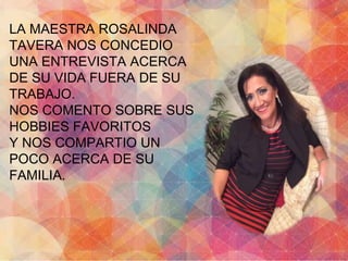 La maestra Rosalinda Tavera concedió una entrevista sobre su vida fuera del trabajo. Discutió sus pasatiempos favoritos como leer y jugar tenis, y compartió detalles sobre su familia. Aunque originalmente planeó una carrera diferente, decidió convertirse en maestra de matemáticas después de reflexionar sobre los consejos de su maestra de secundaria. Ahora disfruta dedicar tiempo a su familia mientras aplica sus habilidades matemáticas.