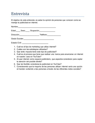 Este documento presenta una encuesta de 7 preguntas destinada a recopilar opiniones sobre cómo se maneja la publicidad en Internet. Las preguntas se enfocan en el tipo de marketing digital, las estrategias utilizadas, el impacto de la publicidad en línea, el proceso para anunciarse en YouTube y otros canales, los aspectos que atraen la atención de los clientes y la viabilidad de la publicidad en YouTube y redes sociales.