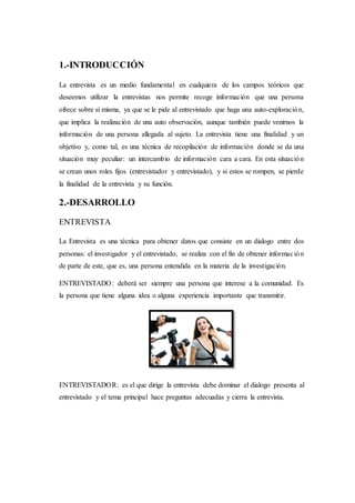 La entrevista es una técnica fundamental para la recopilación de información en investigaciones. Existen diferentes tipos de entrevistas como las estructuradas, no estructuradas y semi-estructuradas. Una entrevista exitosa requiere que el entrevistador dirija bien las preguntas y cree un ambiente de confianza, mientras que el entrevistado ofrece información relevante de manera voluntaria.
