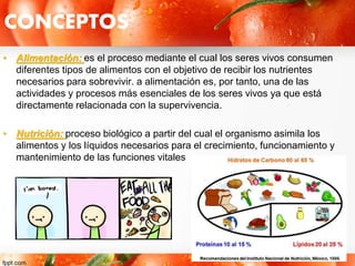 Este documento presenta información sobre la alimentación y la nutrición según entrevistas realizadas a maestros, padres de familia y alumnos. Define la alimentación como el proceso de consumir alimentos y la nutrición como la absorción de nutrientes de los alimentos. Explica que la alimentación se relaciona con la nutrición ya que al comer se obtienen los nutrientes necesarios. Además, señala que se debe considerar factores como la edad, género y actividad física para determinar el tipo de alimentación.
