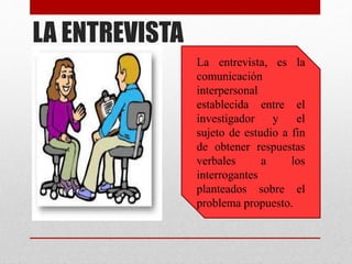 Este documento describe los tipos y propósitos de la entrevista como una herramienta de investigación. Explica que la entrevista involucra una comunicación entre el entrevistador y el entrevistado para obtener respuestas verbales. Luego describe dos tipos principales de entrevistas - estructuradas y no estructuradas - y sus ventajas y desventajas respectivas. También cubre temas como las habilidades del entrevistador y las diferencias entre entrevistas y encuestas.
