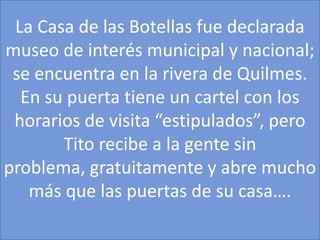 La casa de las botellas es un museo en Quilmes construido por Tito Ingenieri usando más de seis millones de botellas durante 21 años. Tito recibe visitantes gratuitamente compartiendo la historia de cómo construyó su casa única usando botellas y materiales reciclados para darle un mensaje a la gente de que pueden construir su propia casa. Tito rechazó varios títulos honoríficos porque cree que cualquier persona puede lograr grandes cosas si se esfuerza y se anima a crear.