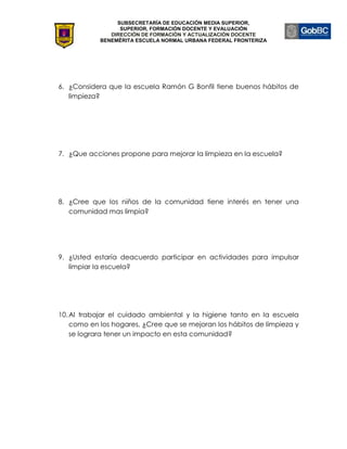Este documento presenta una encuesta de 10 preguntas dirigida a la comunidad sobre problemas ambientales, sus causas, acciones para resolverlos e influencia en los hábitos de los niños. También indaga sobre clasificación de basura en casa, limpieza en la escuela Ramón G Bonfil, propuestas para mejorarla, interés de los niños en una comunidad más limpia y disposición a participar en actividades al respecto. El objetivo final es mejorar hábitos de limpieza e impactar positivamente a la comunidad trabajando el cuidado ambiental y la higi