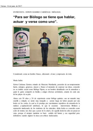 Edwin Cárdenas es un biólogo químico ecuatoriano de 50 años con 24 años de experiencia. Actualmente desarrolla productos de control de plagas para la empresa Molerpa S.A. utilizando materias primas locales. Cárdenas creció en una familia sencilla y trabajadora, y se graduó como biólogo a los 26 años. Desde entonces ha trabajado para innovar en el control de plagas agropecuarias y de mascotas, desarrollando nuevos productos ecuatorianos.