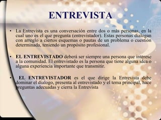 La entrevista de profundidad es una técnica para obtener información oral de una persona sobre su perspectiva personal de una situación. Requiere que el entrevistador establezca una relación de confianza para motivar al entrevistado a expresarse libremente sobre un tema. El entrevistador debe lanzar preguntas iniciales generales y luego hacer preguntas más específicas, usando técnicas como el silencio, el eco o el resumen para relanzar la entrevista cuando se bloquee.