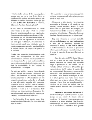 Gabriel García Márquez afirma que no publicará hasta que caiga el dictador Pinochet, y aunque tiene una novela y un libro de cuentos listos, espera que el contexto político en Chile cambie. A lo largo de la entrevista, García Márquez reflexiona sobre su compromiso político, la relación entre el periodismo y la literatura, y la evolución de su obra en respuesta a sus experiencias en Europa y Latinoamérica. Destaca su novela 'Crónica de una muerte anunciada' como una síntesis entre el periodismo y la literatura, abordando temas de la realidad política y el comportamiento humano.