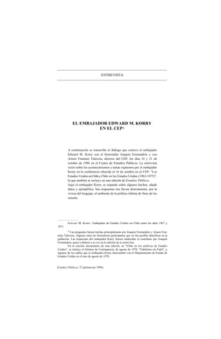 El documento presenta una entrevista con el embajador estadounidense Edward M. Korry, en la que discute eventos y temas cubiertos en una conferencia que dio sobre las relaciones entre Estados Unidos y Chile entre 1963 y 1975. La entrevista conduce al lector directamente a la política chilena de fines de los sesenta a través de las respuestas vivas y detalladas del embajador.