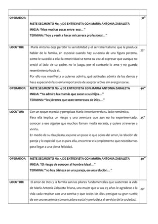 Este documento resume una entrevista radial de 5 minutos y 30 segundos con María Antonia Zabaleta Triana. La entrevista se transmitió el 29 de septiembre de 2012 por la emisora Voces Estéreo 89.4 FM. En la entrevista, María Antonia habla sobre su familia, ciudad natal, estudios universitarios y sueños profesionales. También comparte sus puntos de vista sobre el amor, la religión y encontrar a la persona ideal.